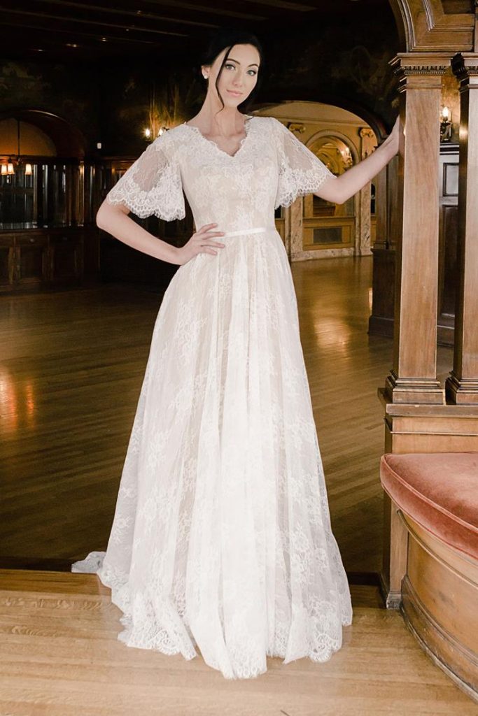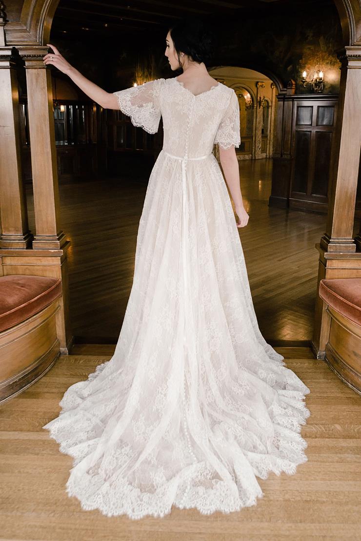 Montana is a modest allover lace and tulle A-line bridal gown features V-neckline, covered buttons down zipper back to hem, short allover lace flutter sleeve with modest cap lining, removeable satin ribbon at natural waist, softly gathered lace and tulle skirt, stretch lining, scallop hem lace, semi-chapel train.